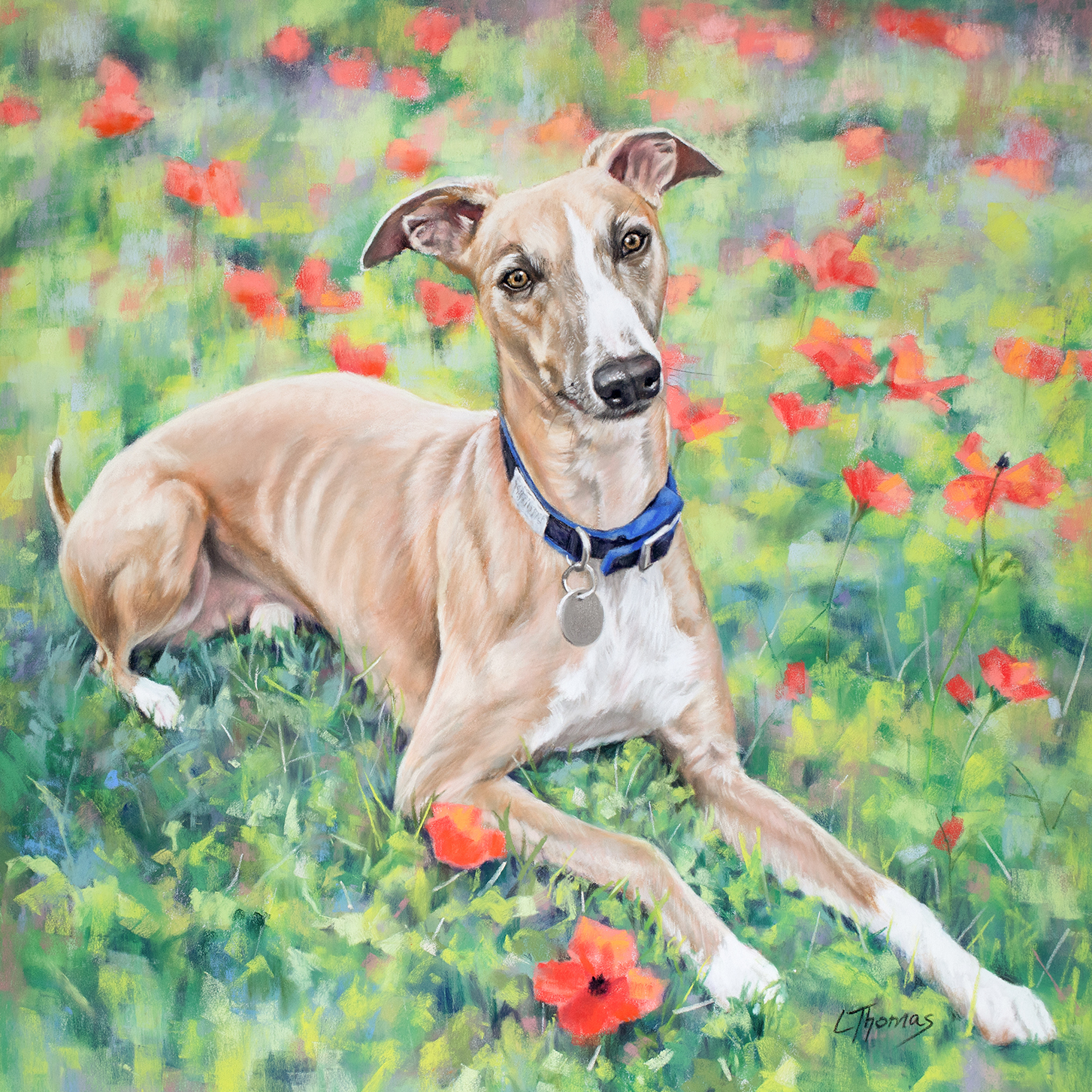 In the run up to Christmas, I was super busy creating pet portraits, which meant keeping most of them under wraps. Now we can finally share a few. This handsome whippet is Chester, and his portrait was commissioned as a special gift for a December birthday. The brief was a lovely one — to capture Chester sitting among wildflowers — and it was a joy to bring this idea to life.